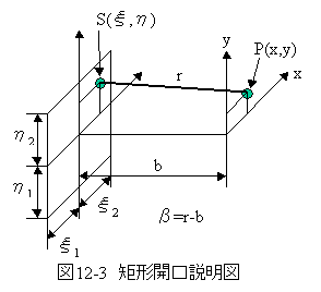 図12-3 矩形開口説明図で(12-4)式を変形します。
