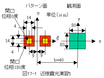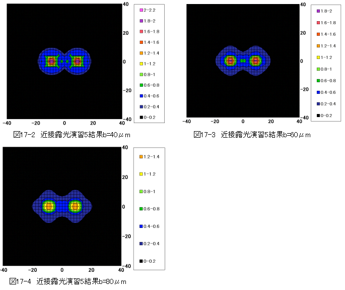 問題:図17-1近接露光演習5に示す開口の回折条件において、パターン面と観察面の間隔がb=40、b=60、b=80μmの場合の光強度分布を求めよ。
